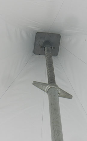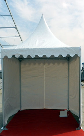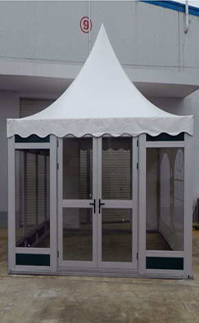 尖頂篷房系列尺寸有3×3米、4×4米,邊高是2.5米,采用二槽的48×84×2.5㎜鋁合金管材做支架。5×5米、6×6和10×10米的尖頂篷房標(biāo)準(zhǔn)邊高是2.5米,用四槽的48×105×3.5㎜鋁合金型材做支架,抗風(fēng)速80公里/小時(shí)。