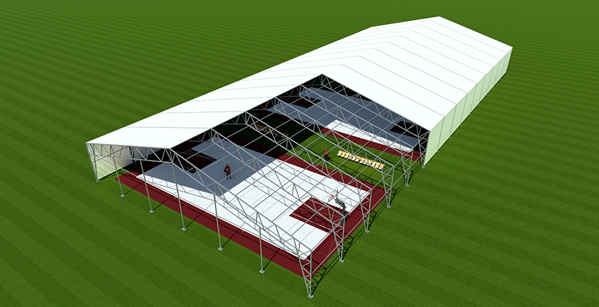 鋼框架篷房的主體結構采用高強度鋼管材料,屋面采用鋼纜斜拉條加固,屋面及墻面均有基布圍護。鋼框架篷房工所用材料及結構具備很高的完整性與安全性。