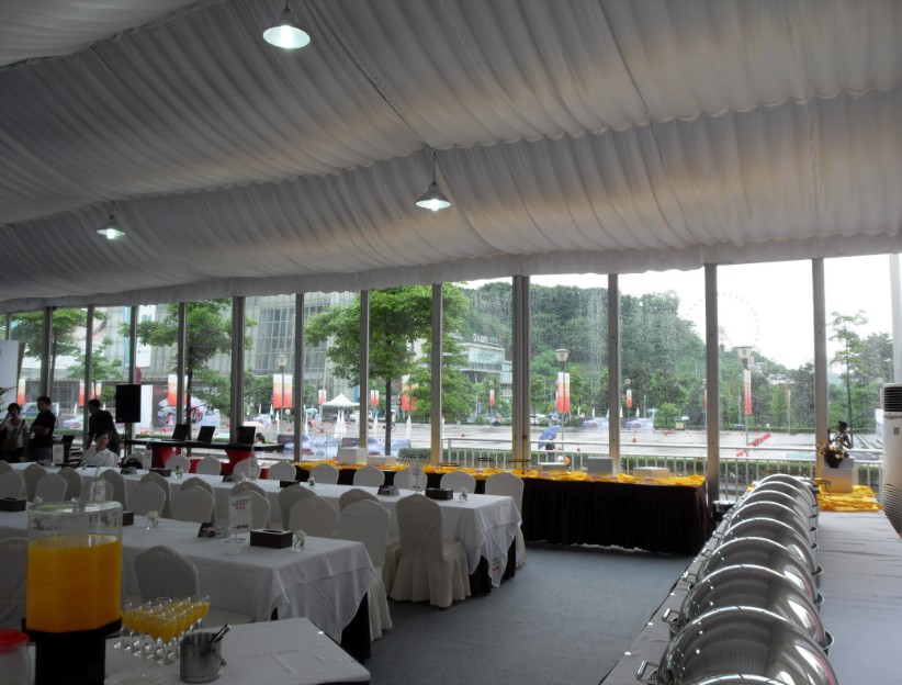 在保證篷房安全、不損壞篷房框架的基礎(chǔ)上,客戶是可以根據(jù)需求進(jìn)行個(gè)性化裝飾的。高山篷房的篷房裝飾規(guī)格多樣,樣式新穎。同時(shí)還提供一些篷內(nèi)天花裝飾布幔、彩鋼硬體墻、活動(dòng)玻璃門、家具、空調(diào)、地板、地毯和舞臺(tái)燈光音響等配套的租賃,一站式的租賃服務(wù)為您省心省力。篷房租賃