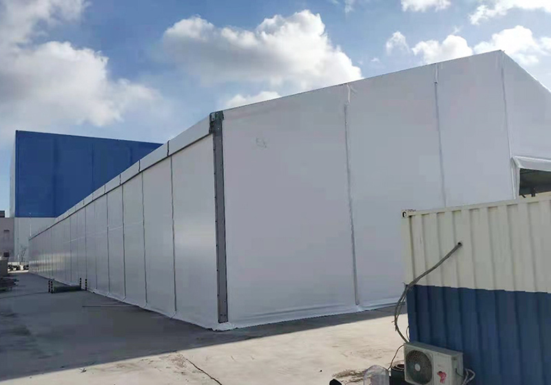 在本次大連冷鏈疫情中,高山篷房提供的2400平的裝配式物流倉儲篷房、22座推拉篷房和6座更衣室篷房已正式投入使用。在抗擊疫情這種緊急時刻,去臨時修建傳統固定倉庫,時間上是不允許的,因此搭建快速、結構安全的裝配式篷房就派上了用場。