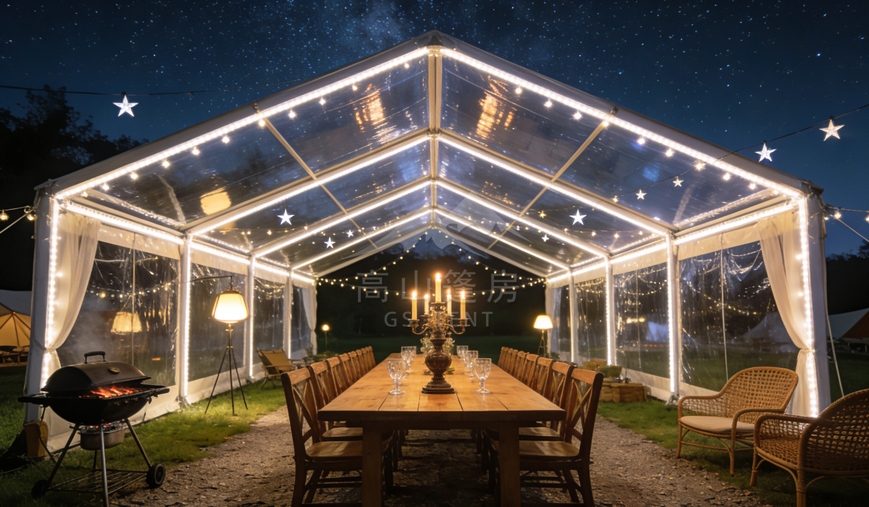 顏值與功能雙向在線,篷房可根據需求定制尺寸、造型與內飾,簡約大氣的外觀適配各類場景格調,婚禮上可搭配花藝燈光,打造浪漫夢幻的儀式感;展會上可靈活劃分區域,彰顯品牌質感;戶外活動中可搭建休閑休憩區,解鎖自然與舒適的雙重體驗。無論是幾十人的小型聚會,還是上百人的大型盛會,都能精準匹配需求,打造專屬專屬場景氛圍。